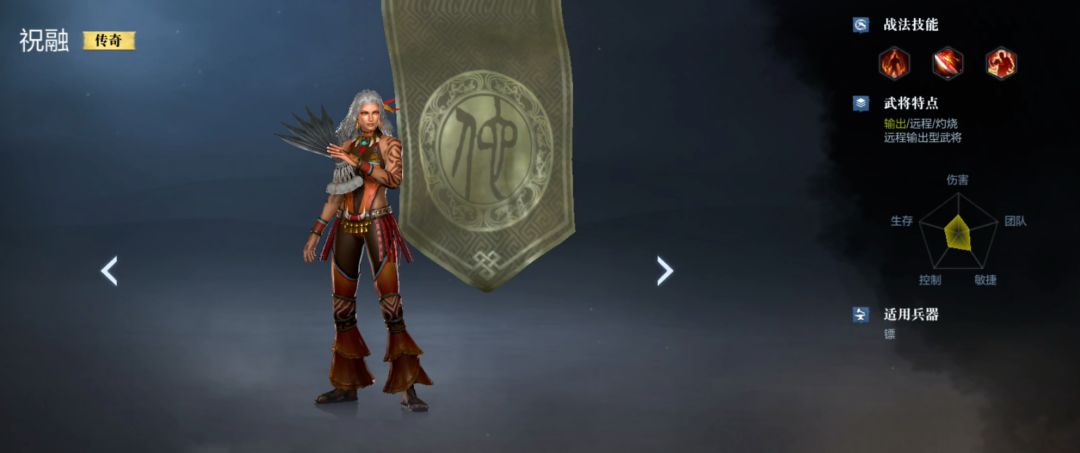 祝融是一位不需要太多养成成本就能发挥优势的输出型武将,当解锁战法【不灭烈焰】与羁绊【闭月何归】之后,祝融就能拥有稳定的附加灼烧能力,持续对敌人造成伤害。极快的普攻速度与较远的攻击距离,能让祝融轻松应对各种模式。