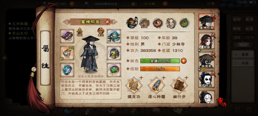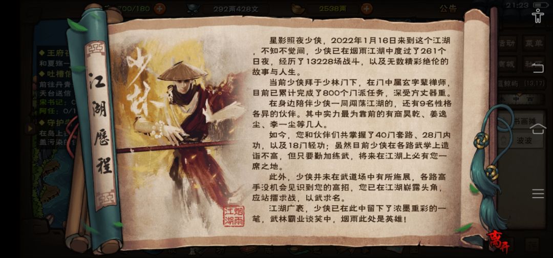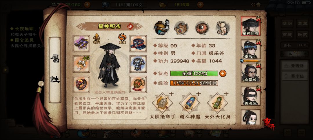 内心感想 我玩了烟雨快两年,tmd第一次出行货商人,然后是本神元功,,,啊啊啊,我本来就还有两百两银两,现在只剩一百两了,md什么时候能摆脱这种穷逼生活😅