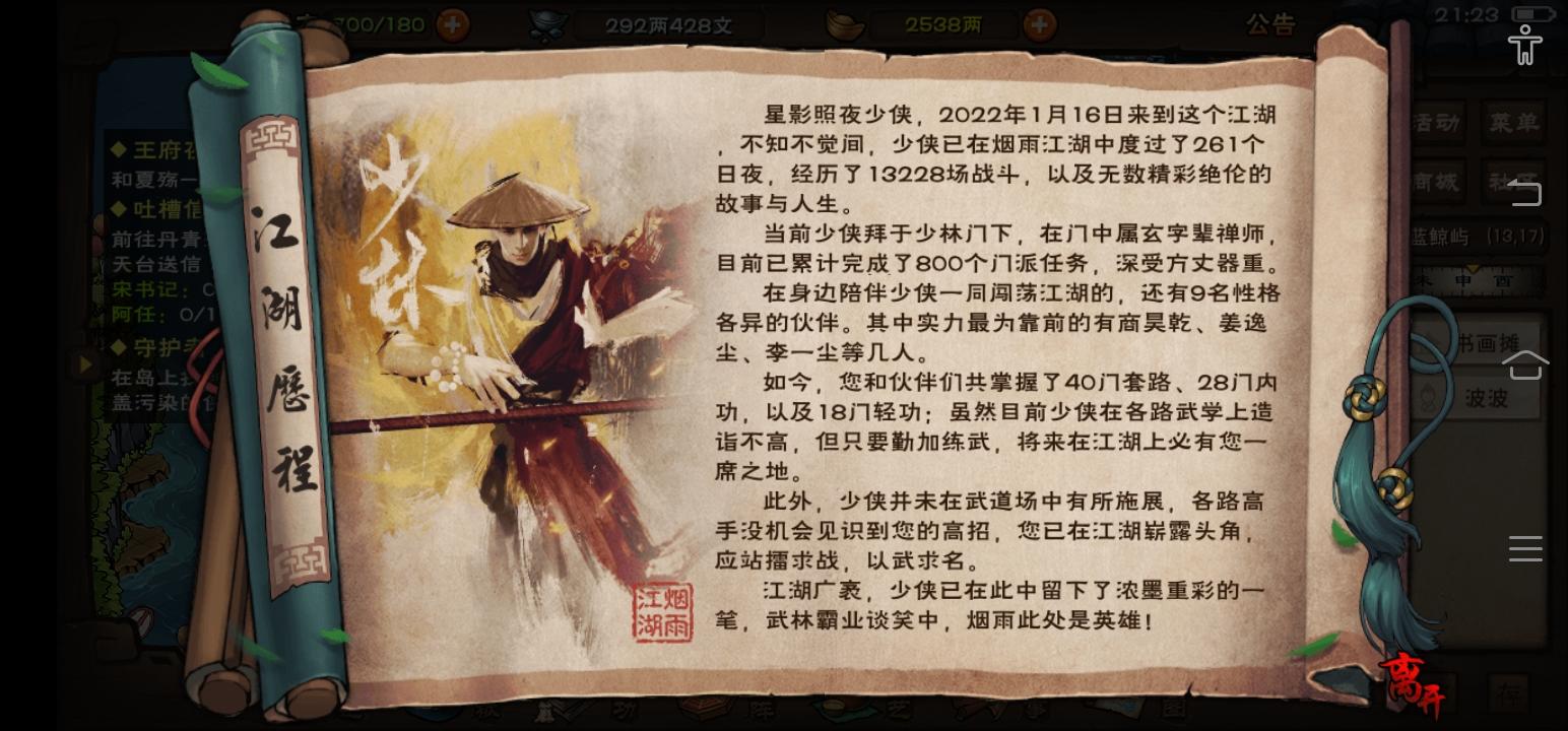 最近出了点事,终于回来了,烟消雨落,江湖启程,大侠之梦将一直延续下去!