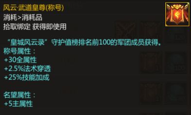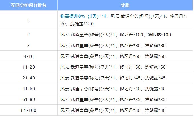 每一期排名前100的军团均能够获得一个限时称号—风云·武道皇尊,以及数量不等的修习丹和洗髓露。