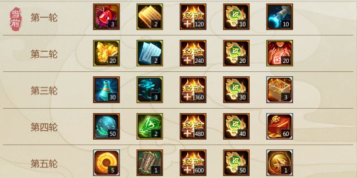 敌军每波5名,共有5波,击败本波全部敌军即可前往下一波。击败敌军有丰厚的奖励,其中包含了四象仙丹、御宝琉璃自选礼包、自选珍材宝箱。