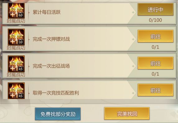 在活动期间,大家可以通过完成每日专属任务来获取封魔战功,提升封魔等级。同样的,如果没有完成或者漏掉了某一天的任务,也可以通过找回来获取未完成的奖励。 免费找回将找回未完成任务的部分奖励,完美找回可找回完成任务的所有奖励。 完美找回可选择找回5天内任意天数的奖励,免费找回不可选择找回天数。完美找回需要消耗的梦三币与未完成的任务数相关。 封魔等级