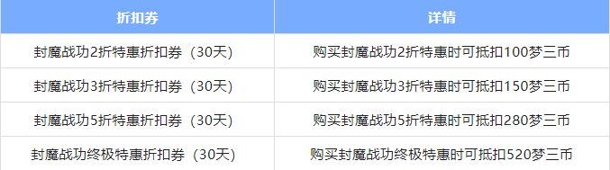 大家还能够从中获取到1200个封魔战功,每个封魔战功可以提升10点经验,也就是说,可以直接将封魔等级提升10级。 另外,在这个礼包中,梦梦也为大家准备了几张封魔战功特惠折扣券,大家在购买封魔战功特惠包时,能带来不同的折扣,这些都能帮助大家快速提升封魔等级。