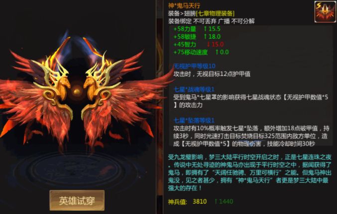 神*鬼马天行 神*鬼马天行有着强大的技能,受到鬼马七星罩的影响获得了七星战魂状态,攻击时有10%的概率触发七星坠落,额外增加18点破甲值,持续3秒,同时光速打击目标焚烧325范围内敌方单位,造成【无视护甲数值*5】的物理伤害。
