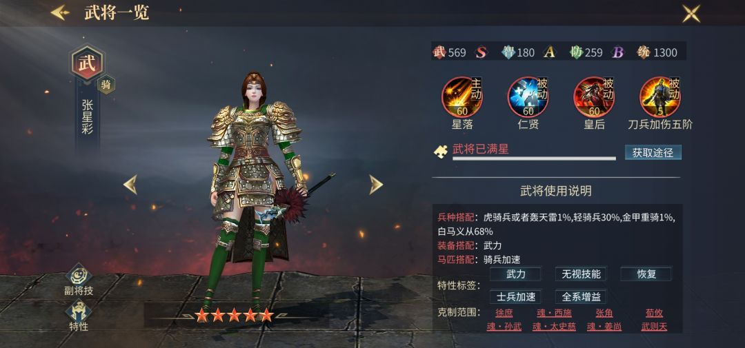 张星彩做为本游戏中唯一一个克制三系属性的武将,在当前版本中大放异彩,高属性的武力值加上禁止副将的特性,更是让他具备了独一档武将的资质,配合丁奉副将和双刀军器,可以做到输出爆表又足够坚挺,为当下版本中最强武力将,当选天梯榜眼位。