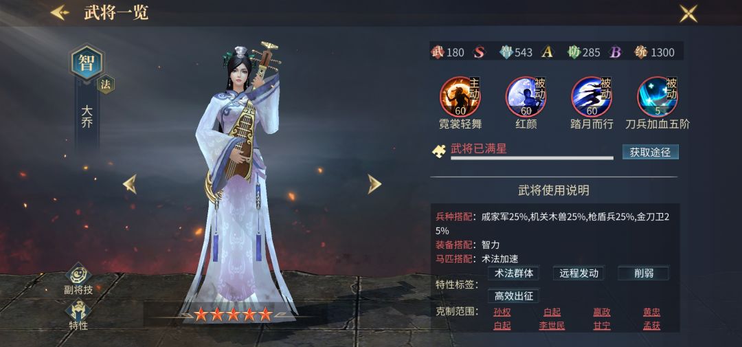 高战对战攻必有大乔,高效率的疲劳恢复和低损耗的疲劳出战,成了大乔最显著的特点,禁止敌方被动的特性也是大乔得以纵横战场的优势,专杀防御将和武力将,配合高回复的程普或魂华佗,能让大乔更丝滑的在战场生存,当选天梯第九名。
