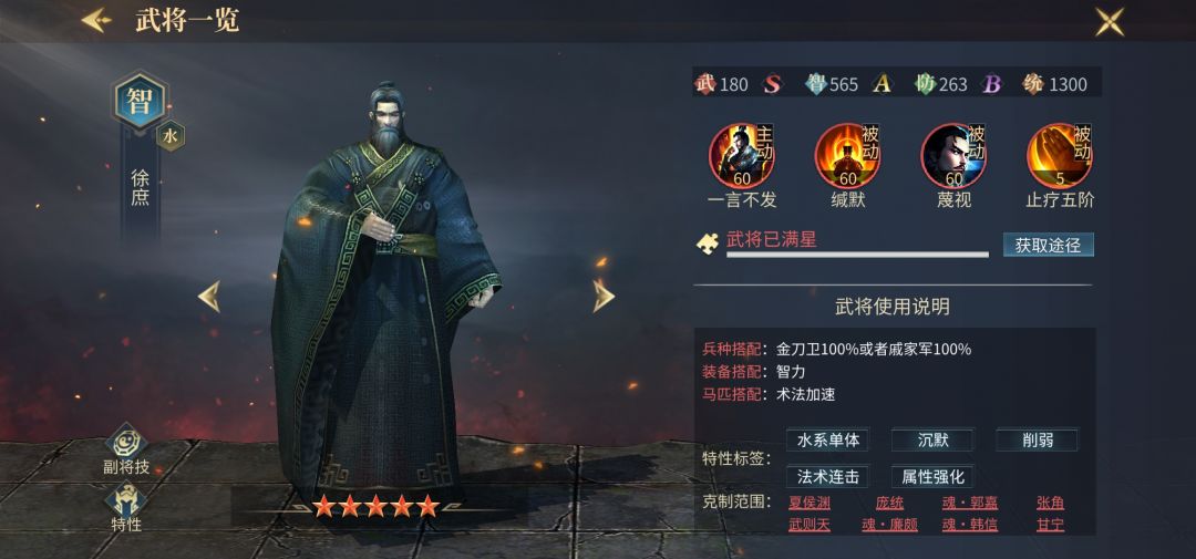 徐庶热度由来已久,从一开始诞生到现在,依旧有很多玩家对他趋之若鹜,独特的百分比减智机制和缄默技能,让他在无数智力将中脱颖而出,专属的二次出手更是破除回合免伤机制的利器,各类让人头疼的武将徐庶都有办法进行制裁,为此游戏公司不断开发针对徐庶的武将,他也是目前唯一一个在不同版本都被针对的武将,当选天梯第四名。