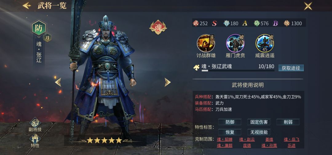 魂张辽作为一个新进崛起的魂将,战场强度让人眼前一亮,半武半防的搭配加上目前高军器的刀系兵种,攻防一体,对攻可秒杀当前主力流派,副将搭配多种多样,配合大佬全系皮肤加成,还可进行再度开发,潜力巨大,当选天梯第六名。