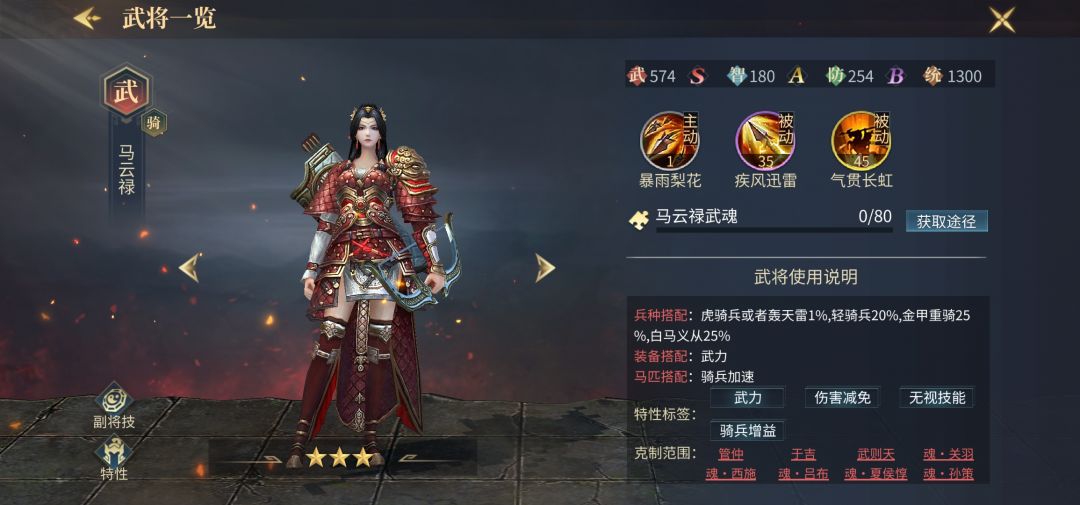 马云禄刚刚诞生的那两个赛季,可以说是绝对的王者,对攻厮杀无敌,第一次引进了回合免伤的机制,以前研究如何克制马云禄成为了对战双方最头疼的问题,当前版本配合夏侯渊副将的使用,更是成为了平民和低战的噩梦,刀兵马云禄也是一个新型的流派,打克制战力满满,当选天梯第七名。