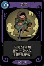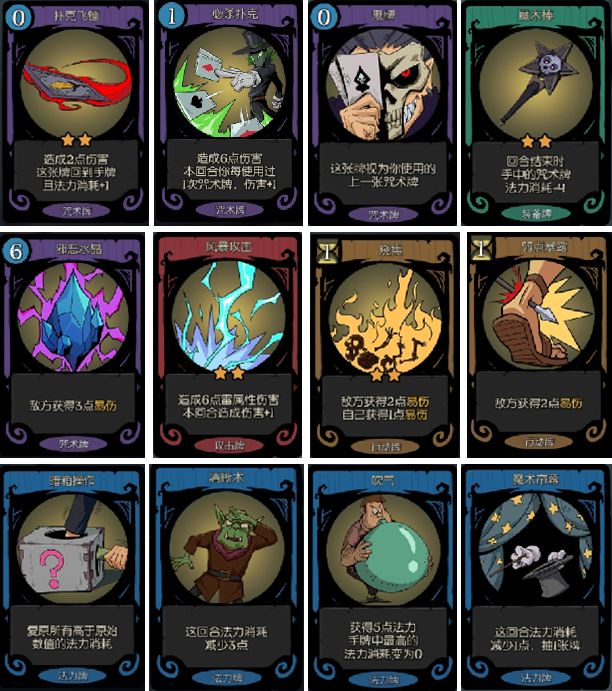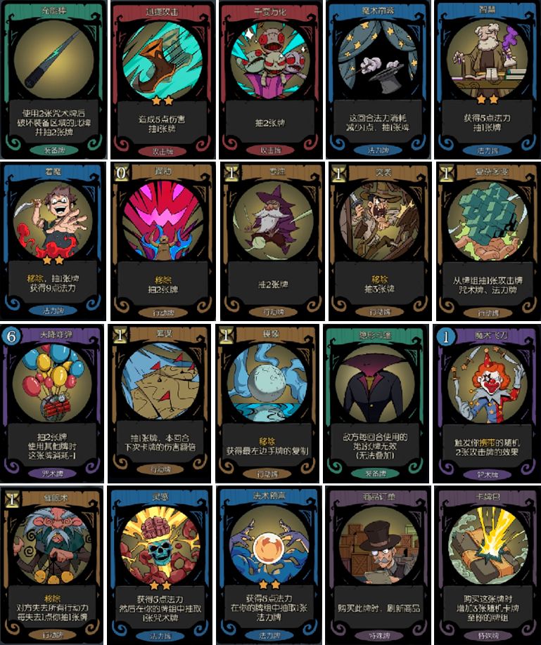 【充能棒】起手装备,过牌。【迅捷攻击】伤害+过牌。【千变万化】优秀过牌,还是张攻击牌。【魔术帘幕】过牌+减耗。【智慧】【着魔】著名白嫖卡。【躁动】【专注】【突袭】知名过牌。【复杂多变】给魔术师比给修女有用得多。【天降炸弹】优秀过牌。【筹谋】过牌+伤害翻倍。【镜像】【鬼牌】复制卡,尤其复制悬浮。【隐身斗篷】狗命神装,反制流可以不拿。【魔术飞刀】魔术师大部分流派是可以带攻击牌的。【催眠术】过牌不多的话可以带上补充。【灵感】【法术预言】也可以当过牌用。