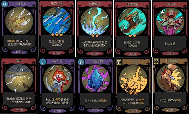 - 核心玩法:主要靠【千把刀】的多段伤害来打输出,配合增伤和攻击牌增频。