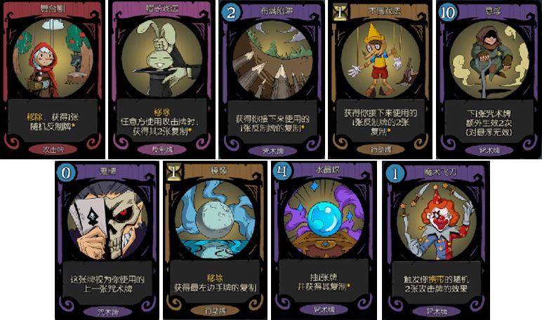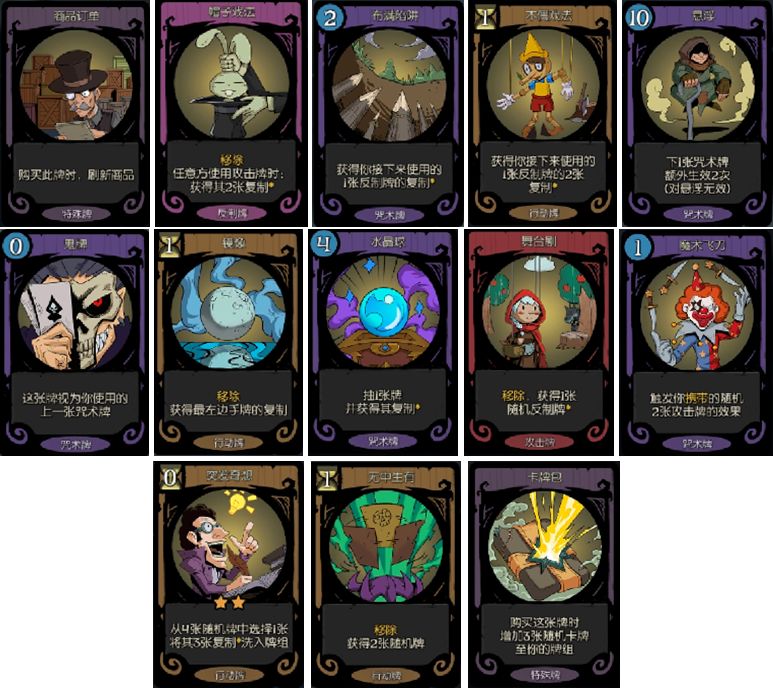 【舞台剧】二章大概率出。【帽子戏法】一章大概率出。复制舞台剧用。【布满陷阱】【木偶戏法】复制帽子戏法用。【悬浮】复制布满陷阱用。【鬼牌】复制悬浮用。【镜像】【水晶球】复制悬浮和木偶戏法用,复制其他也行,看需要。【魔术飞刀】触发舞台剧用。