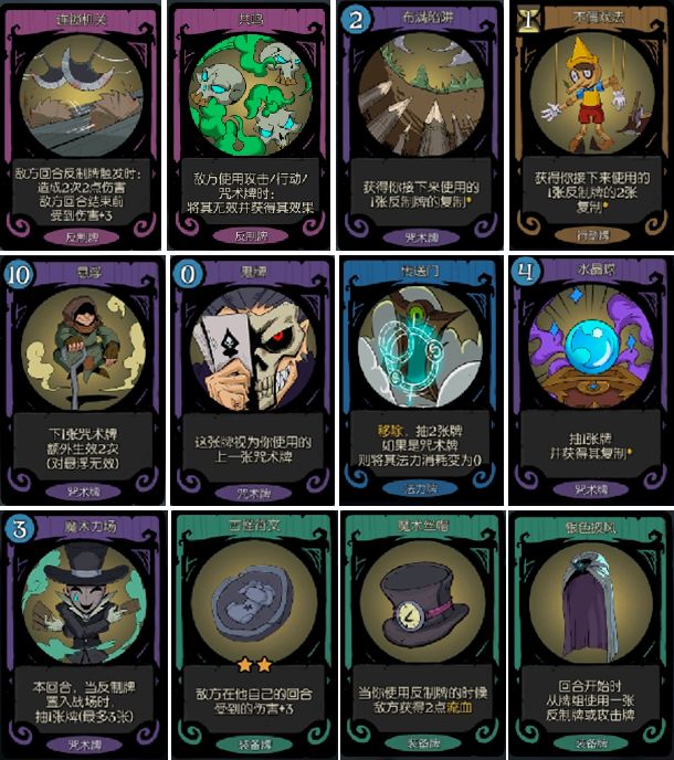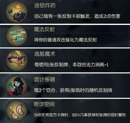 【连锁炸药】推荐开局刷这个祝福。【魔法反射】普攻变反制,但是遇到巨人就尴尬了。【逃脱魔术】节约蓝量。【诡计多端】增加反制牌。【欺诈空间】白嫖怪物卡牌。