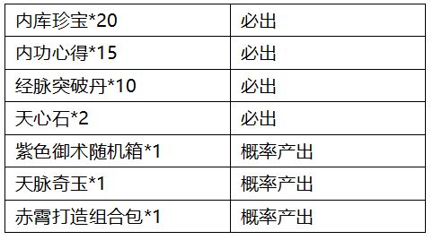 赤霄打造组合包使用后必定获得天脉奇玉*3,并且随机获得以下材料中的一件:玄天寒铁*1、秘银蚕丝*1、天外炙铁*1、广寒乌木*1;