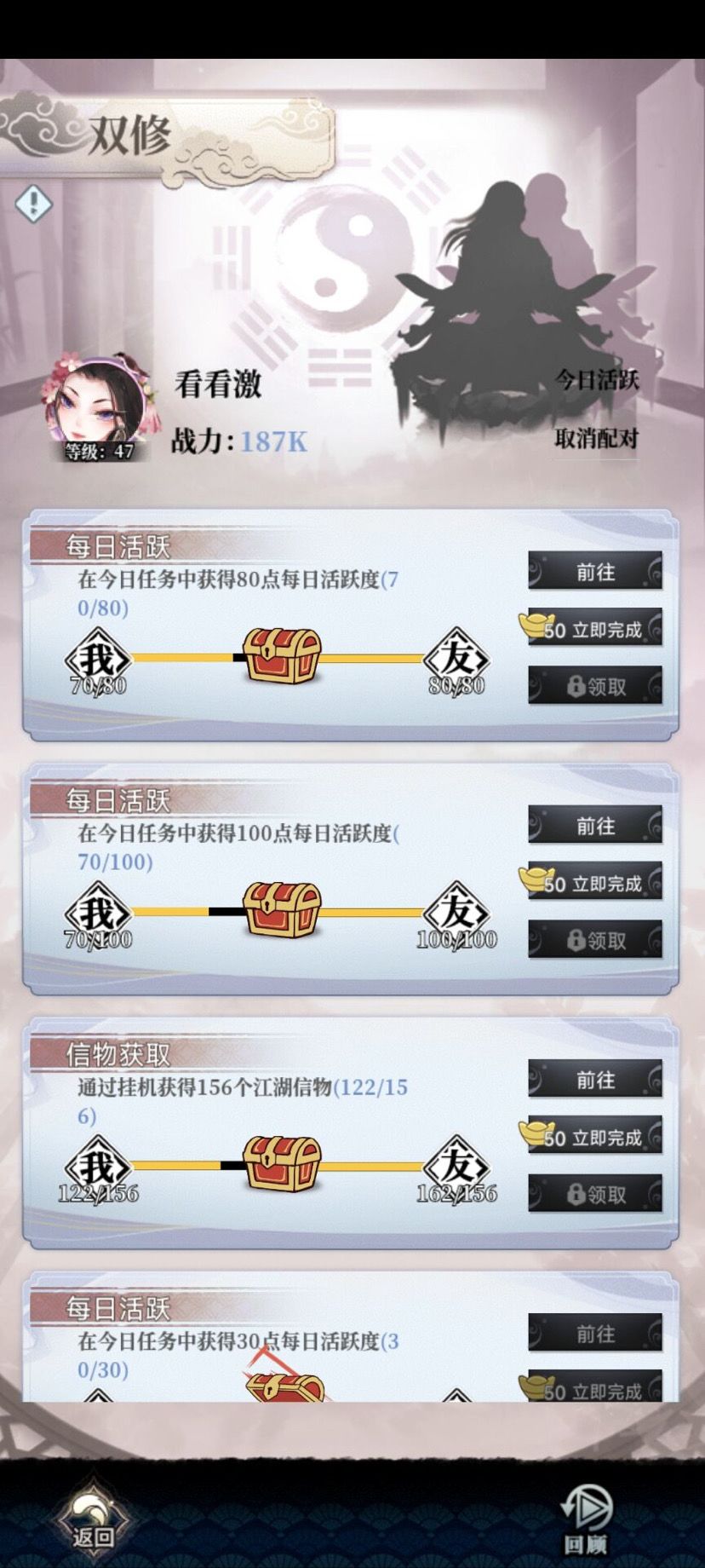 视频是我的双修任务,截图是我双修好友的,他一个人做了两遍运镖领了两次奖励,活跃、信物任务也只能他领,我这边根本没更新,都是昨天的状态