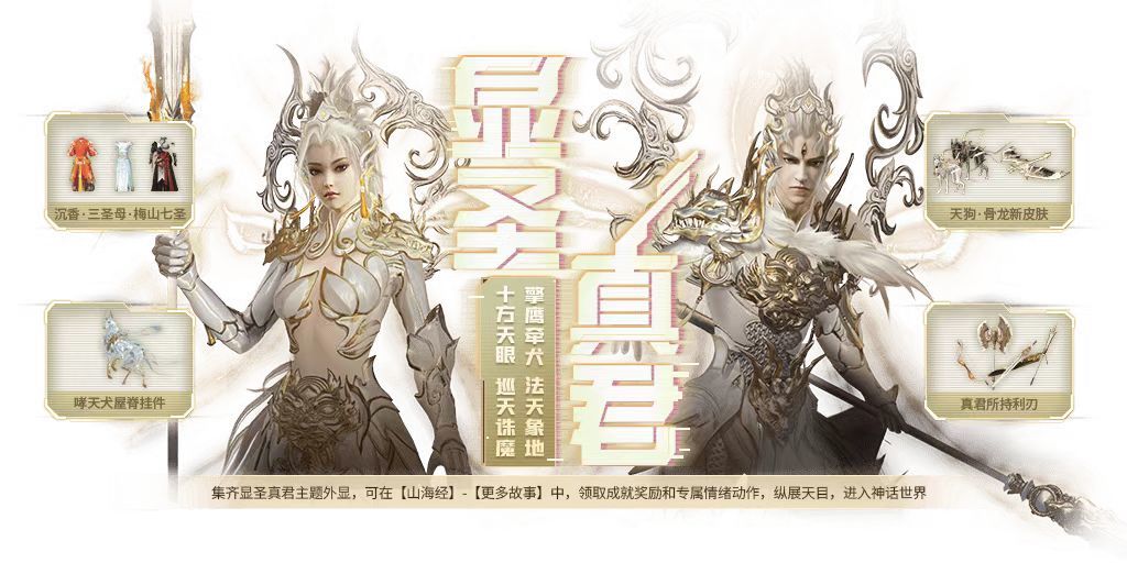 集齐显圣真君主题外显,可在山海经中领取成就奖励,享受专属情绪天气、歌曲、武术表演,以及重磅七十二变玩法,进入全新的神话世界。
