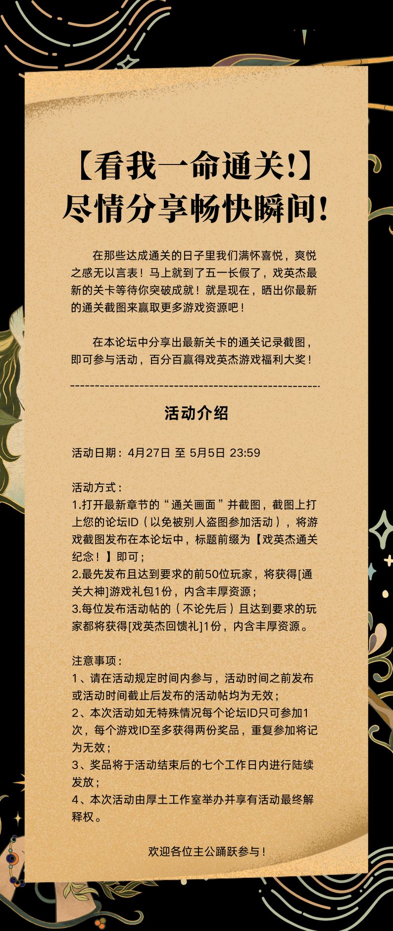 在本论坛中分享出最新关卡的通关记录截图,即可参与活动,百分百赢得戏英杰游戏福利大奖!