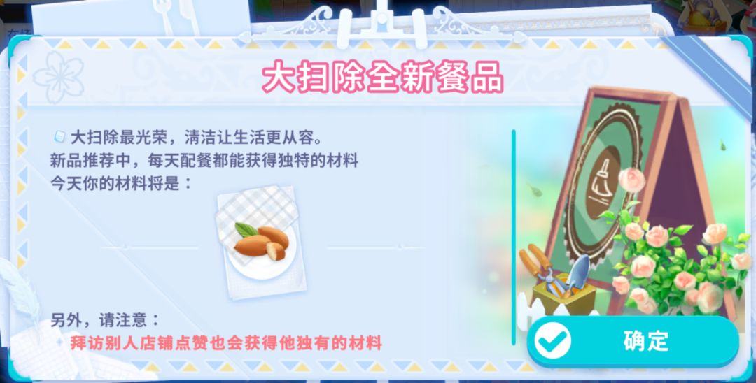 玩家参与限定配餐,通过拜访和店长其它玩家获得相关的餐品配料,进行顾客配餐,获取兑换道具!