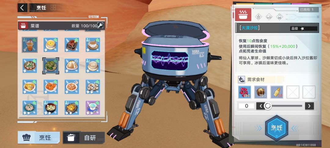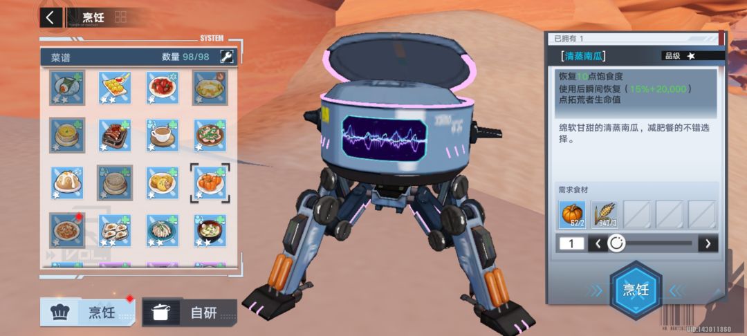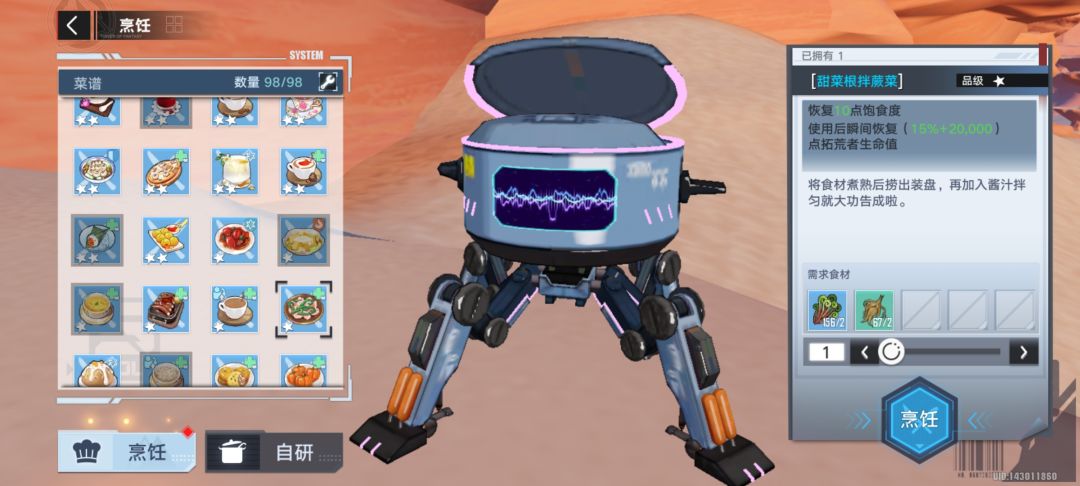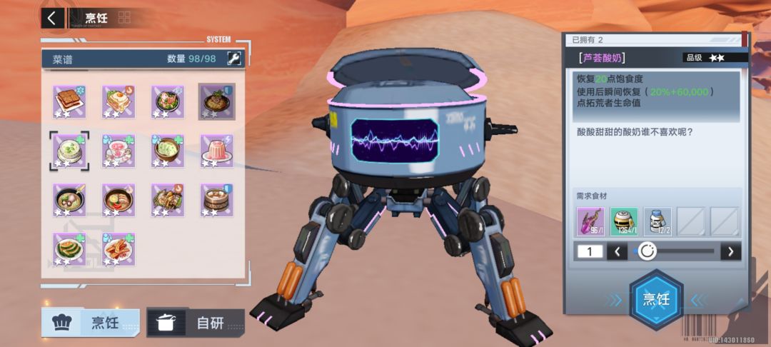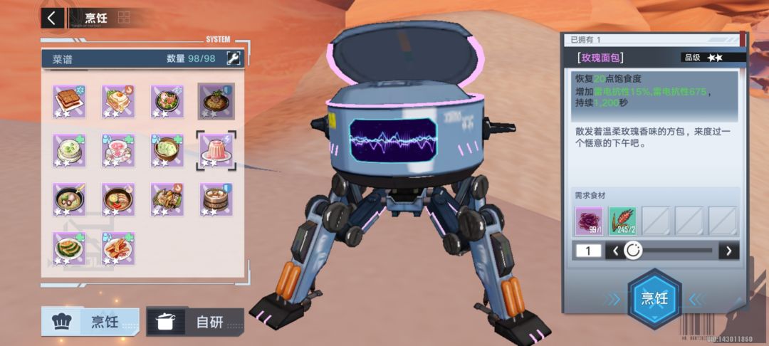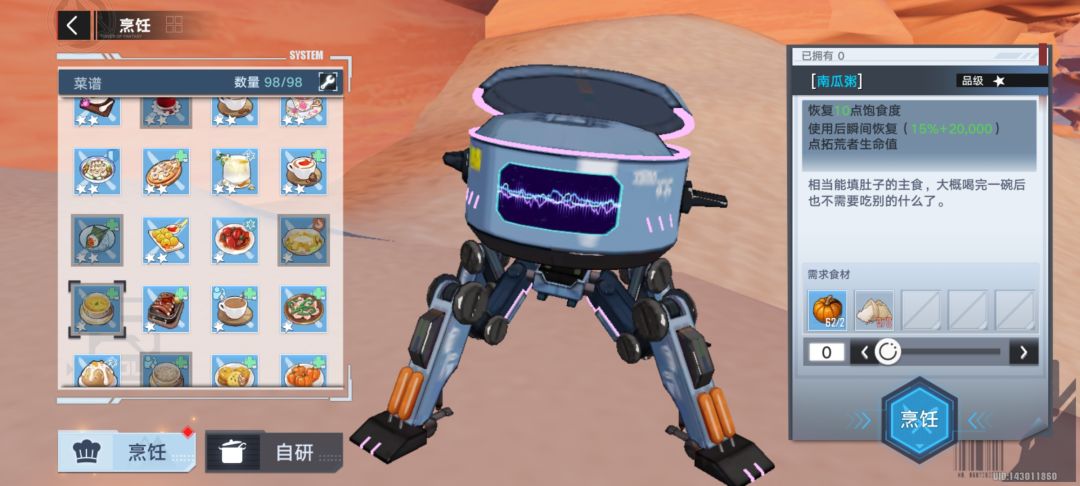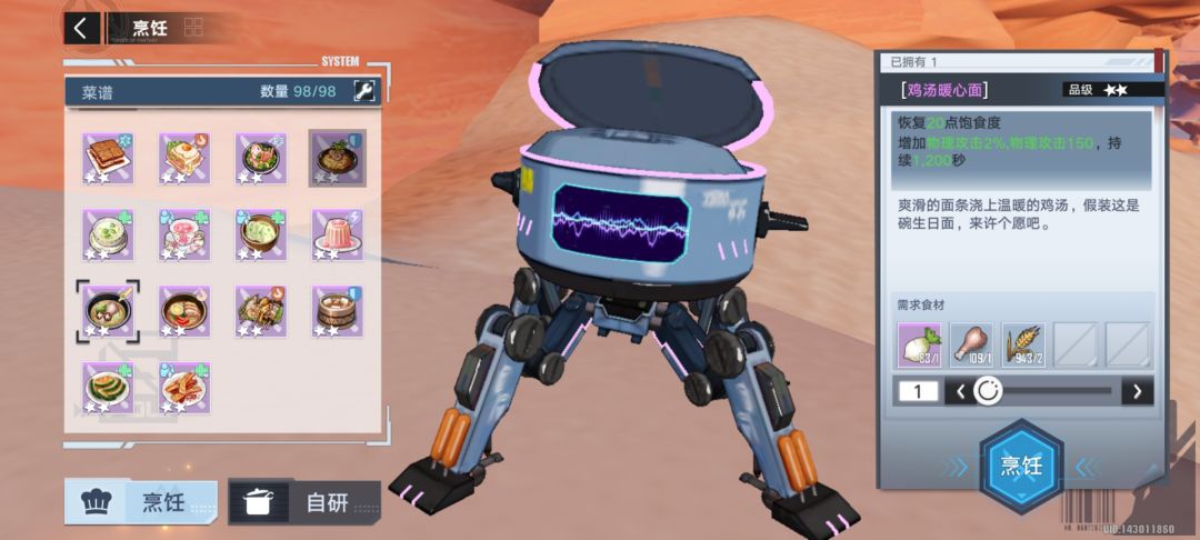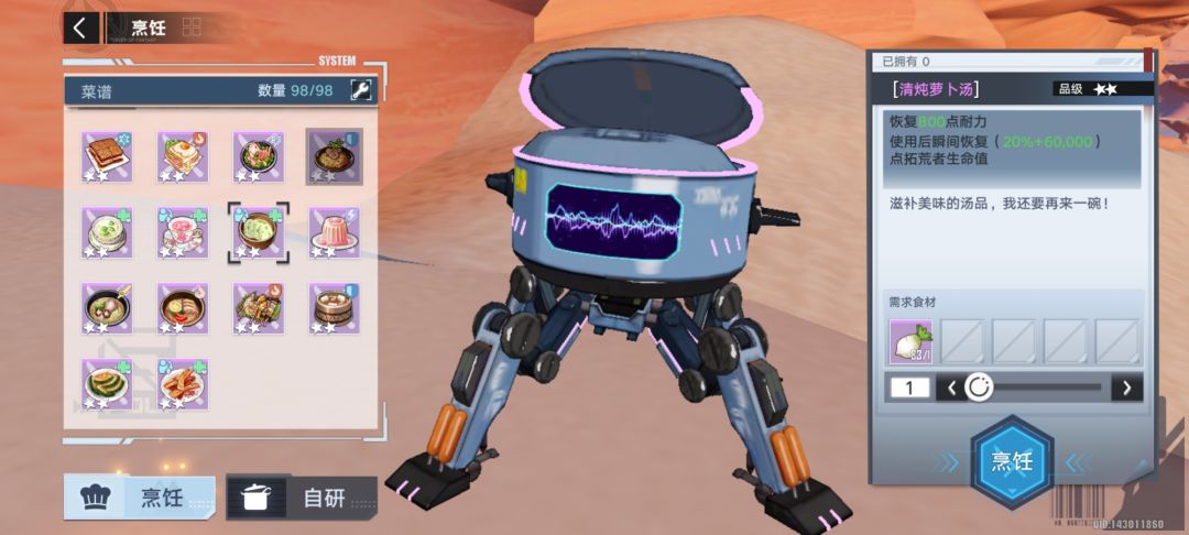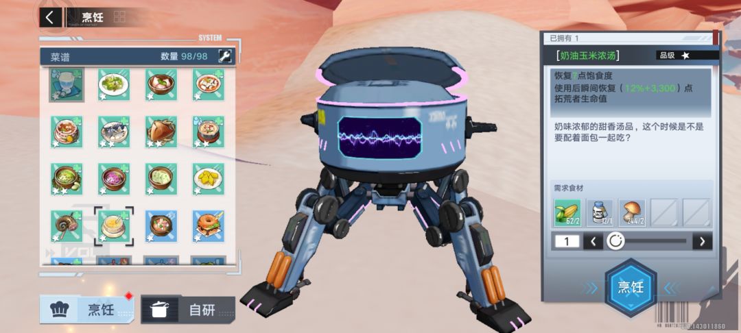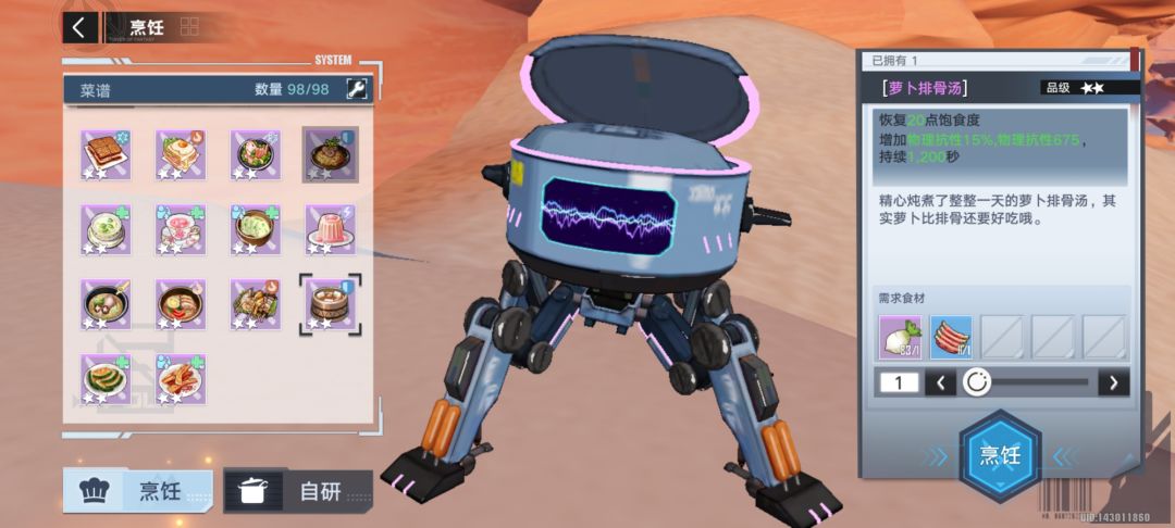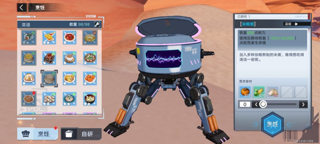 自研投入:白玉萝卜*3禽类的肉*3霍米基麦*6