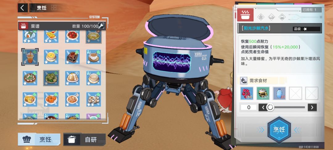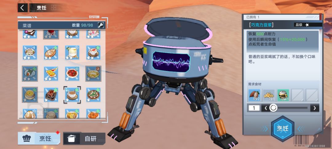 自研投入:可可豆*6黄豆*3蜂蜜*3