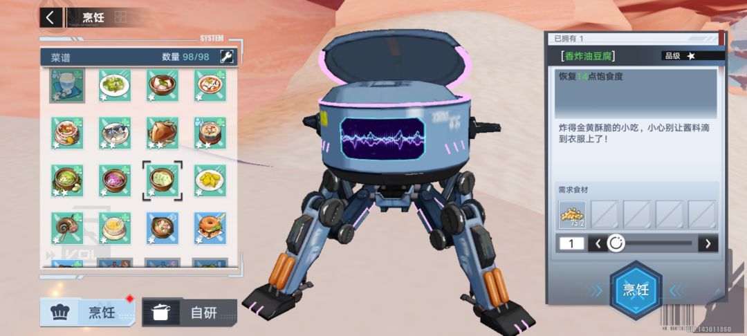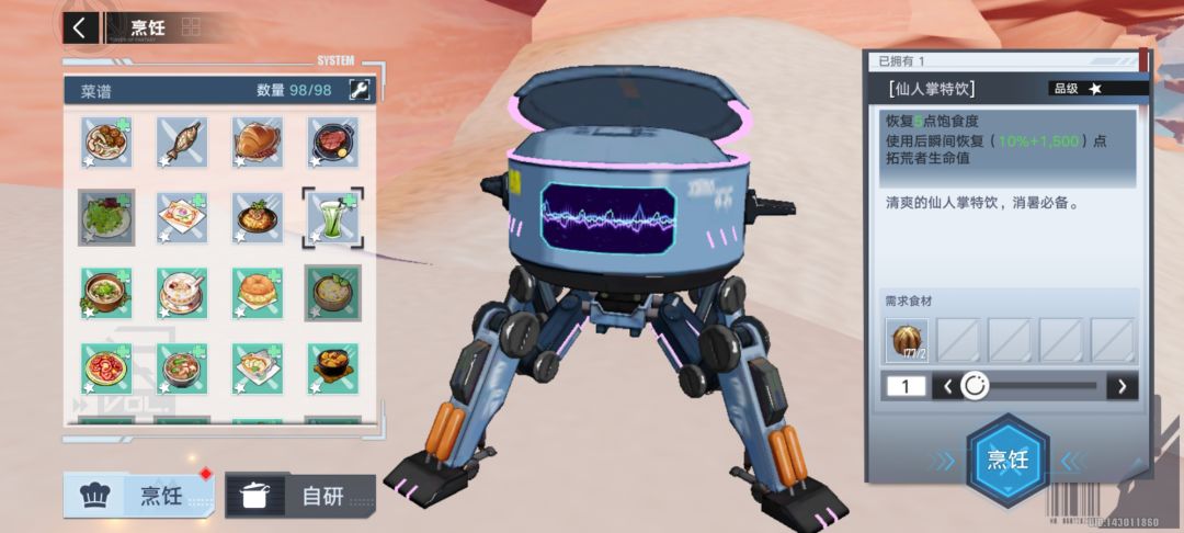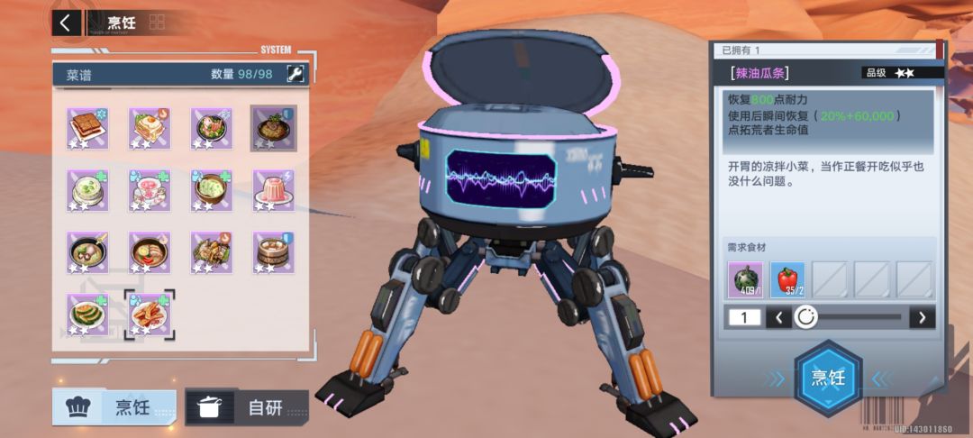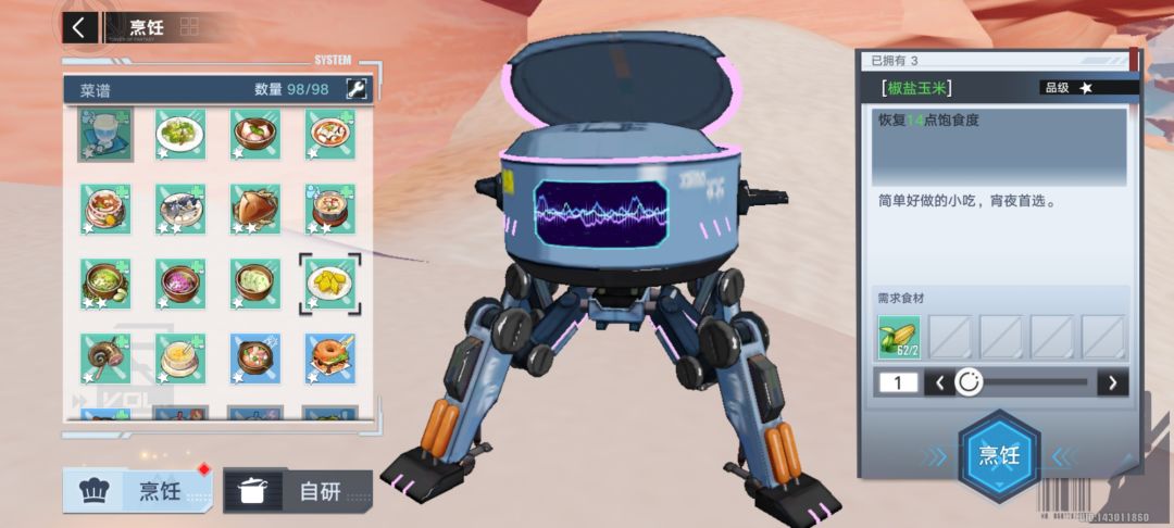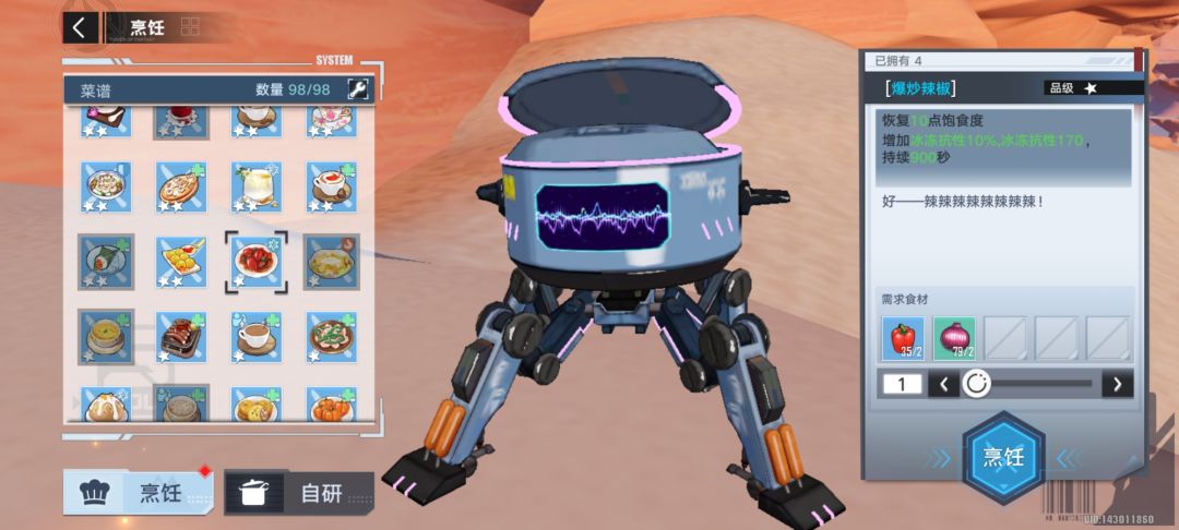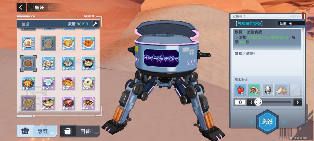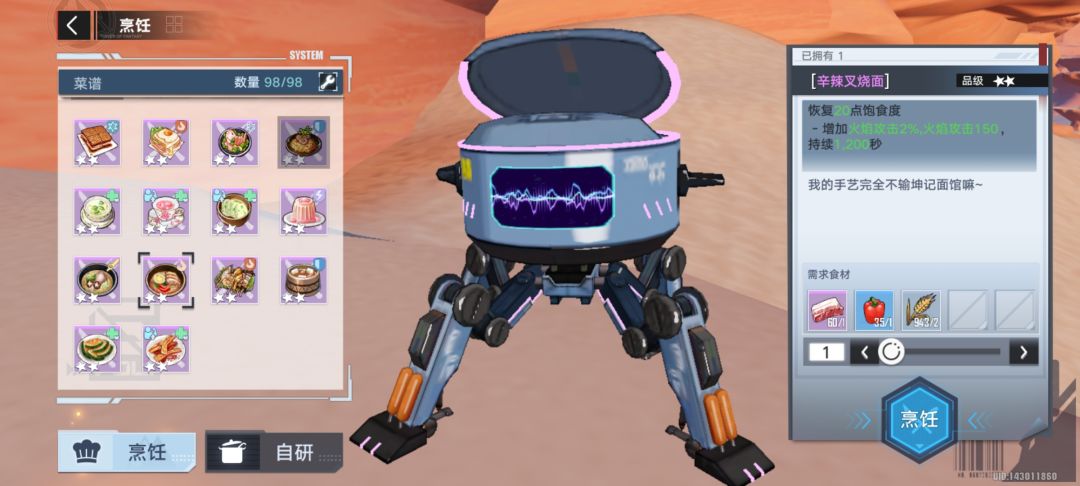 自研投入:多脂兽肉*3辣椒*3霍米基麦*6