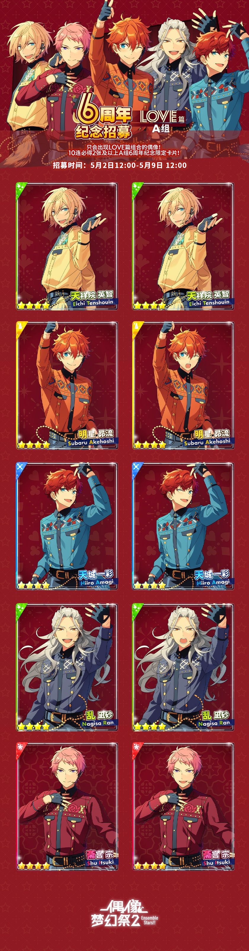 ●6周年纪念招募卡池只会出现LOVE篇组合的偶像。10连必得2张及以上A组6周年纪念限定卡片