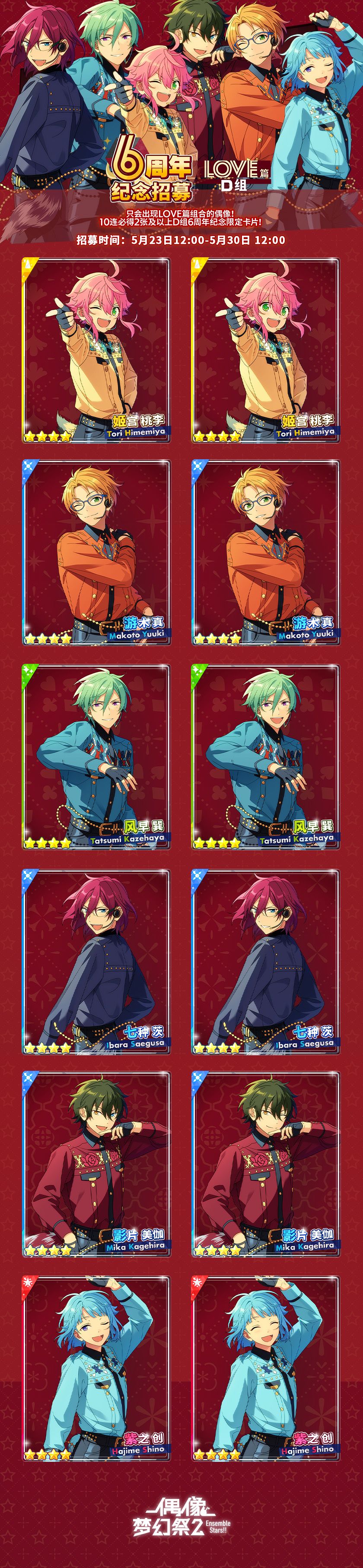 ●6周年纪念招募卡池只会出现LOVE篇组合的偶像。10连必得2张及以上D组6周年纪念限定卡片