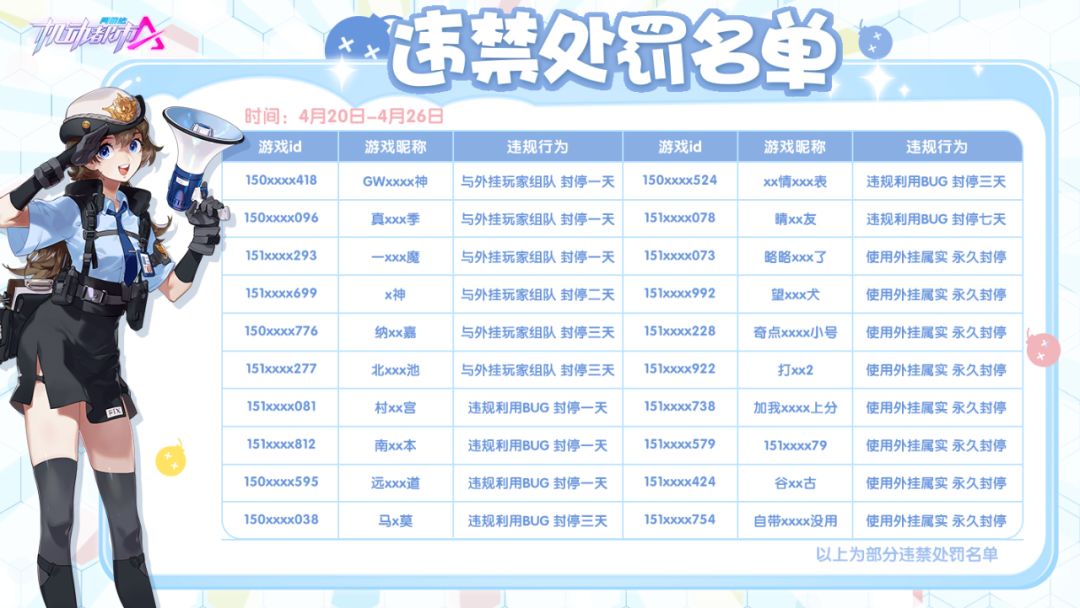 现将截止4月20日-4月26日的部分违禁处罚名单进行公示: