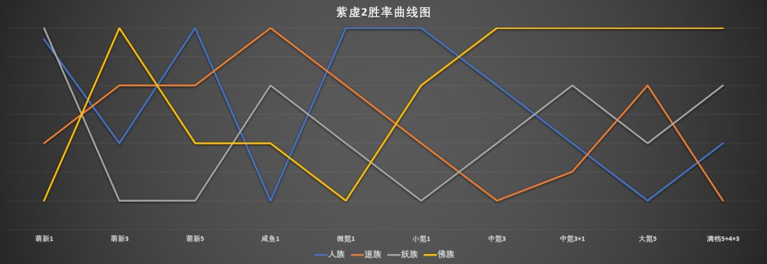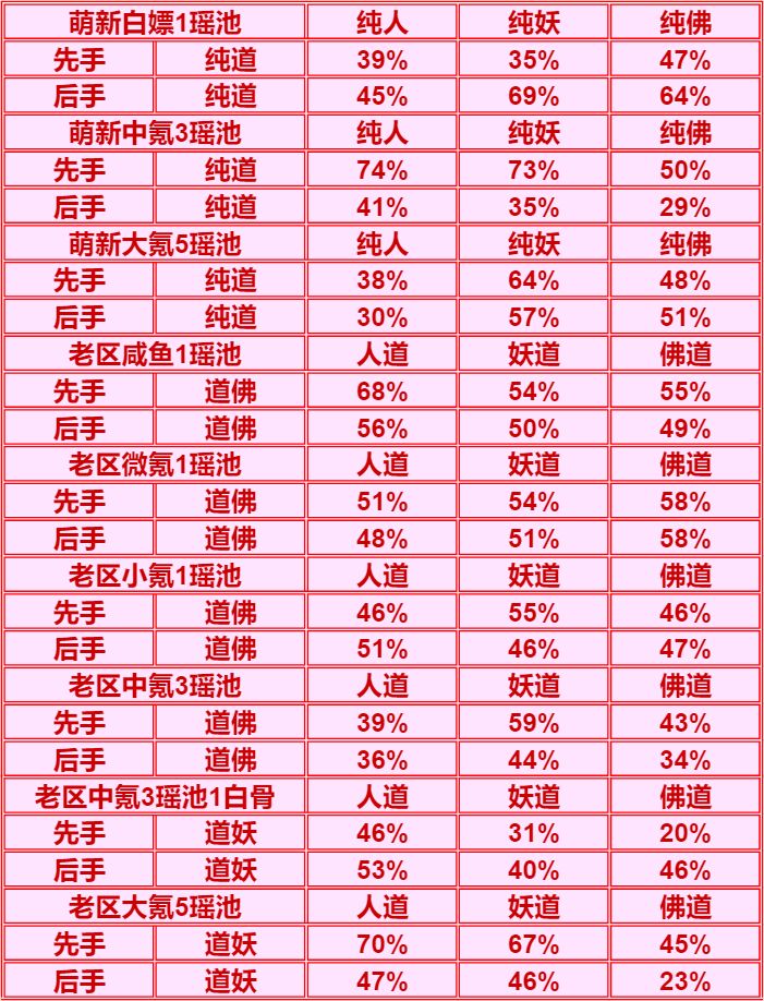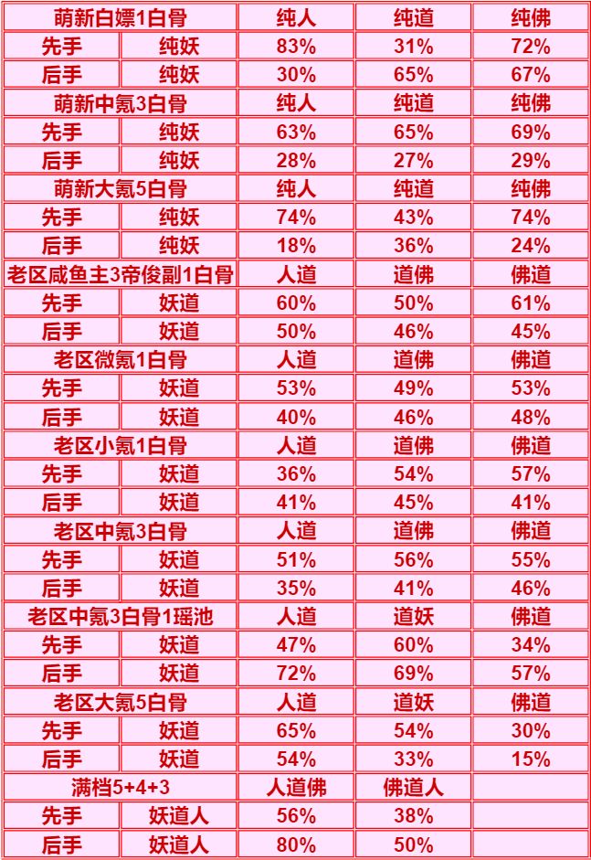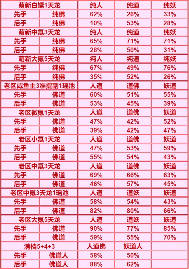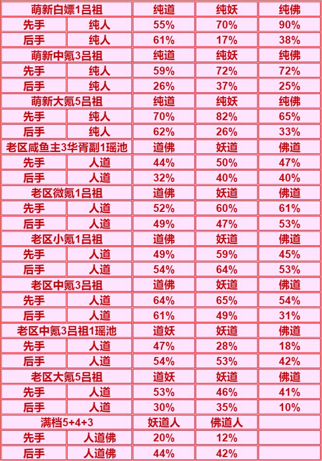 老区大氪档:由于测试时紫二单5强于3+3,所以采用单5胜率,妖族挺纠结的,少了瑶池的辅助妖族不好发挥,但是紫二3+3又打不过单5,在本档次显得平平无奇,但也比人强。