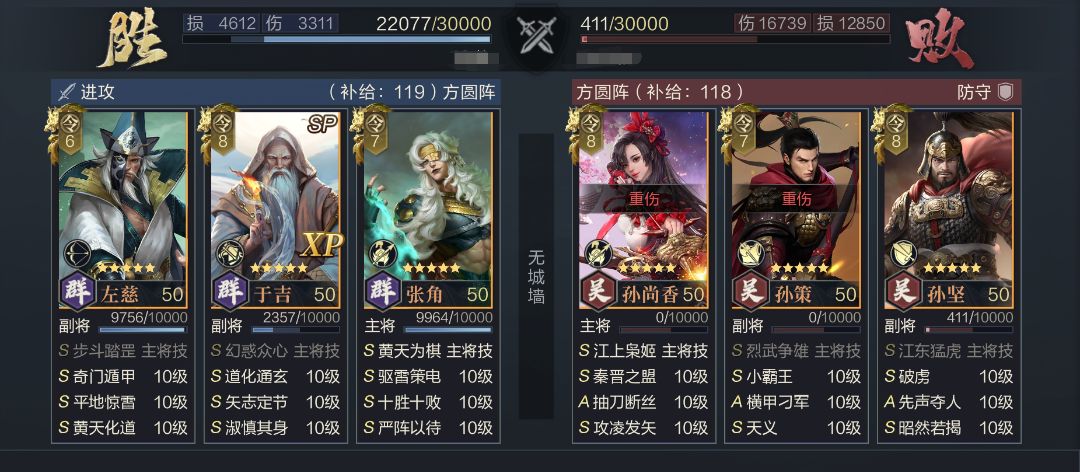 实战效果替换SP于吉后的三仙面对三孙、蜀骑、三枪、灵帝等武力队时有更多优势,基本都可以触发两次属性交换,相比常规三仙有着更高的承伤,但因为少了华佗的净化,在对阵黄天、魏智等高频负面联动队伍时会更考验双方的净化能力,与法系队伍交换属性的收益也会低一些。