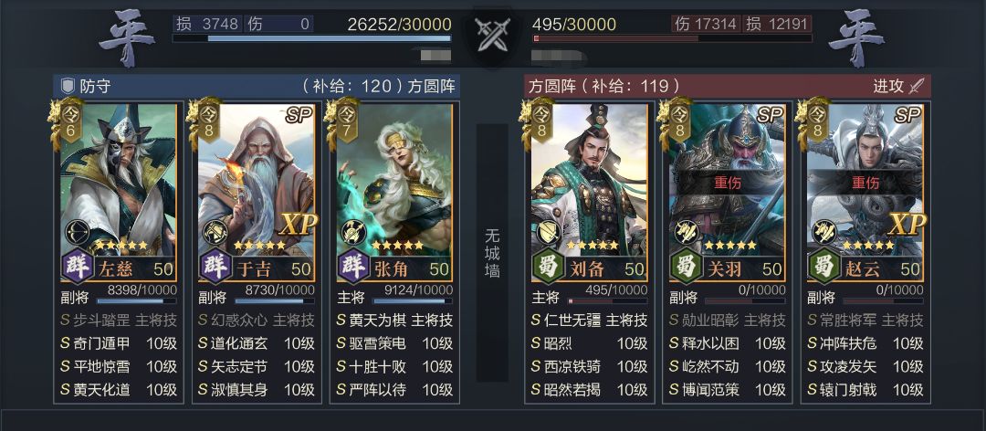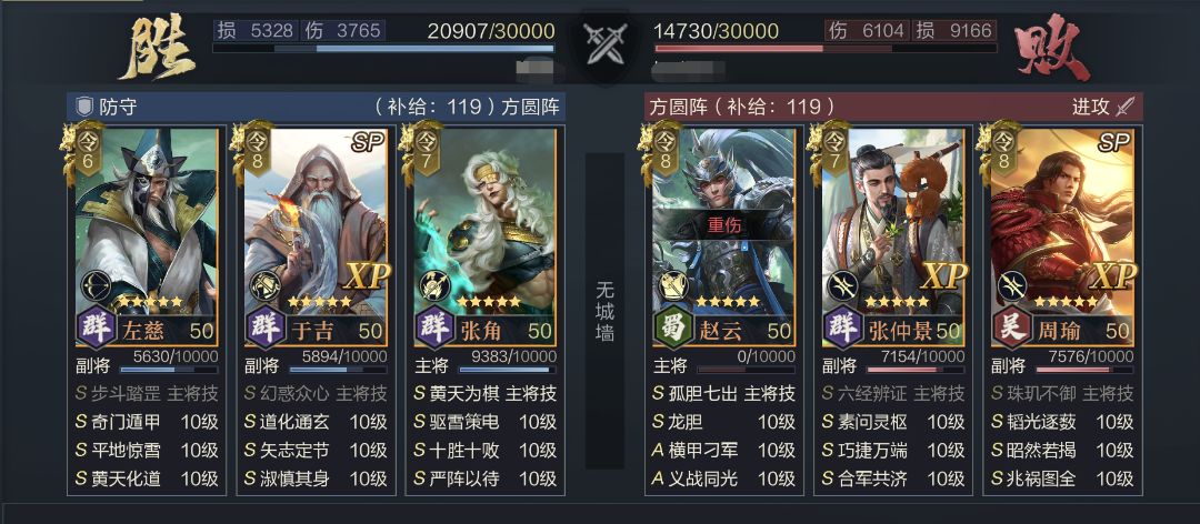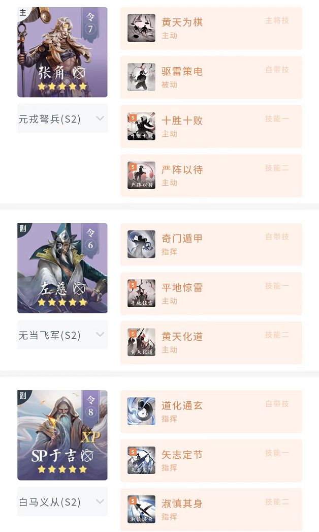 站位:3(SP于吉)5(张角)6(左慈)或2(SP于吉)5(张角)6(左慈),三仙需尽量保证左慈能处于后排位置享受矢志定节的增伤。