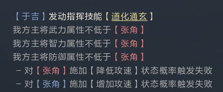 技能效果在这里小图就不多赘述啦,需要注意的是道化通玄在比较属性时是按武力、智力、防御、攻速的顺序进行,只要触发两次交换便会停止。所以多数情况下敌方被交换的属性多为武力、智力其中一个,若己方是智力主将则大概率再交换一次防御,若是武力主将则有机会交换攻速。
