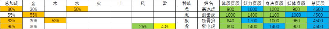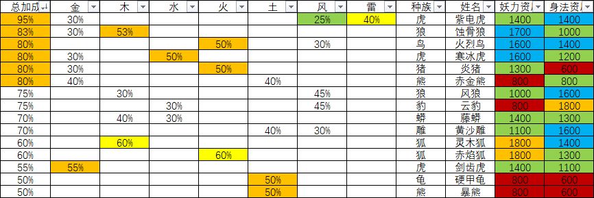 乍一看似乎前排的总加成都高的离谱,但将主(加成)灵根与副(加成)灵根分开之后,许多宠物一下就被刷下去了。例如紫电虎与赤金熊,在属性特殊加成没有实现之前,他们的加成纯粹是虚高,冲着练气期雷系扛把子去的玩家,可以暂时犹豫一下了。