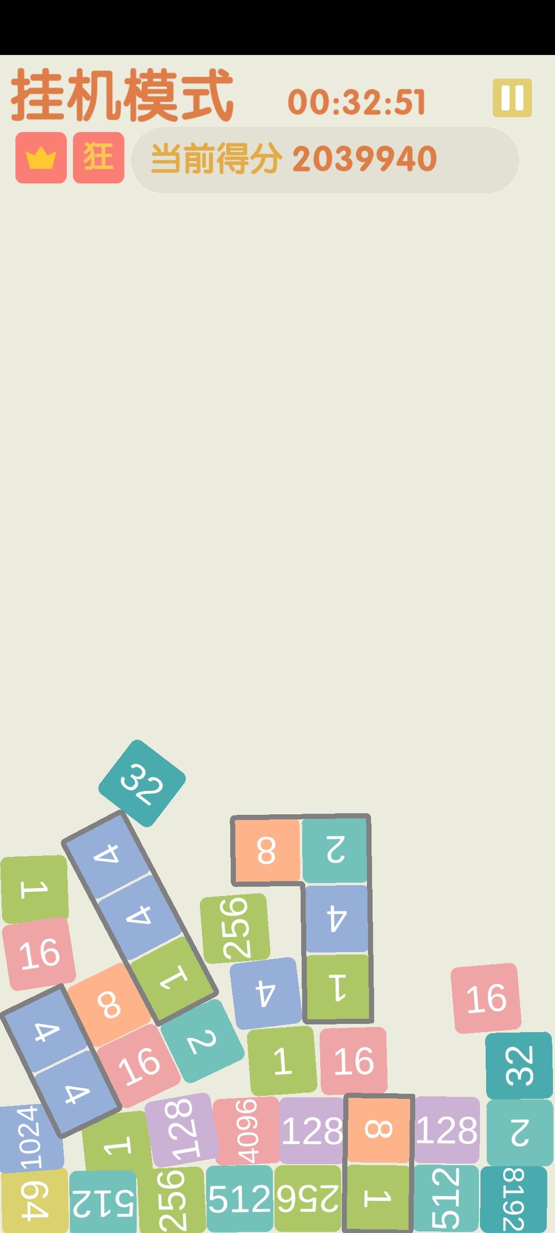 挂机模式好像有个bug,就是最下面一排特别挤的时候,会把某些块挤出屏幕,刚刚我发现我少了一个4096,变成浮窗模式之后发现被挤在了左下角,而且出不来,没办法再次合成