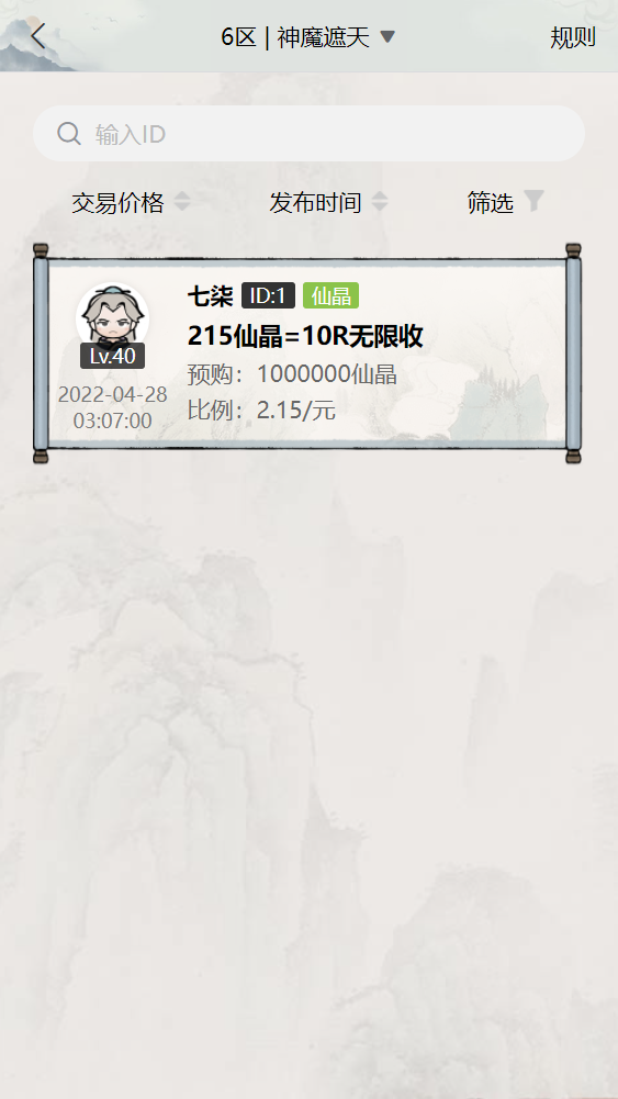 3、在平台市场内搜索对应的价格ID,如77,就可看到ID77发布的收购、出售以及联系方式。