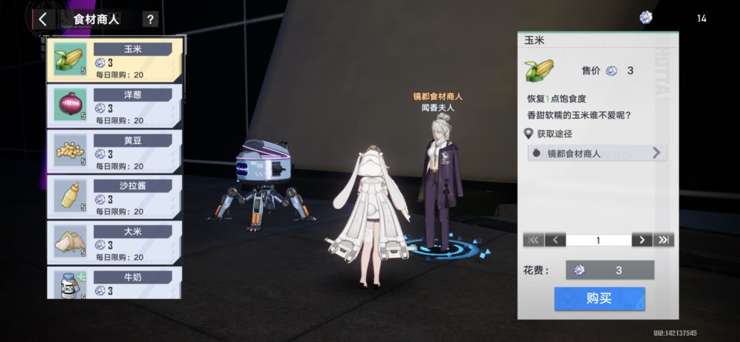 首先我们前往镜都的接待处,径直走到尽头右转就可以看到闻香夫人,在这里我们可以购买到黄豆和玉米,大家节约购买,因为目前镜元币还是很稀缺的。