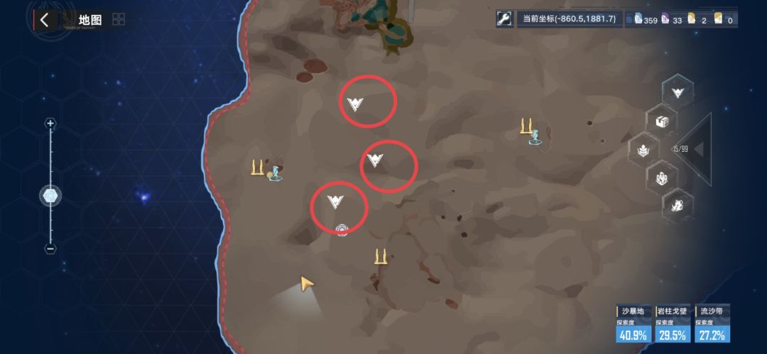 南瓜在流沙带边上产出,一共有三片流沙带,下图三角标记。