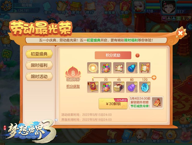 4月29日5:00-5月18日24:00,完成日常获取积分可领取奖励(花好月圆服务器4月28日提前开启)。