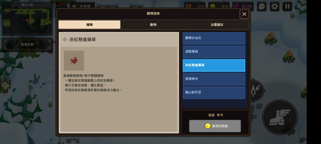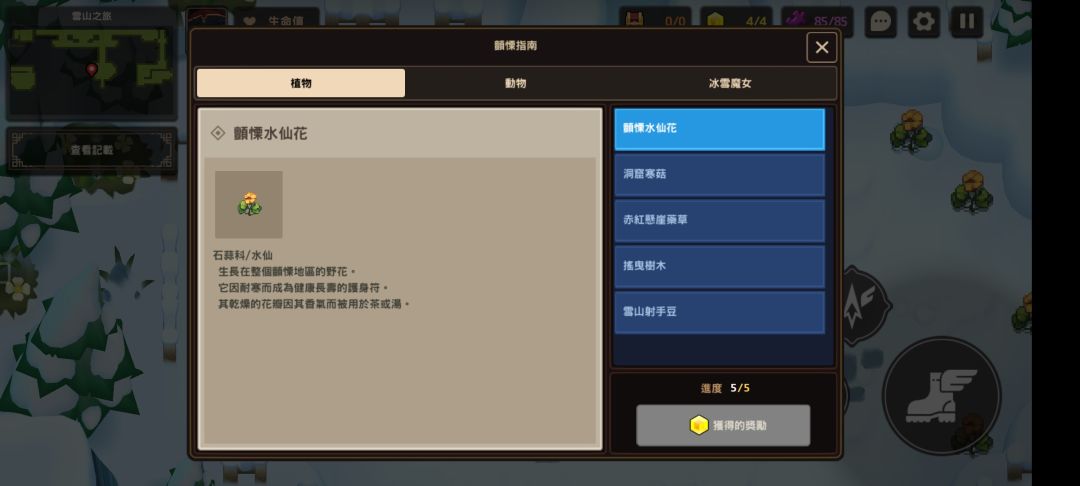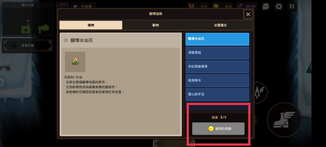 完成以上全部5种植物的信息记录即可在查看进度界面领取黄碎片奖励