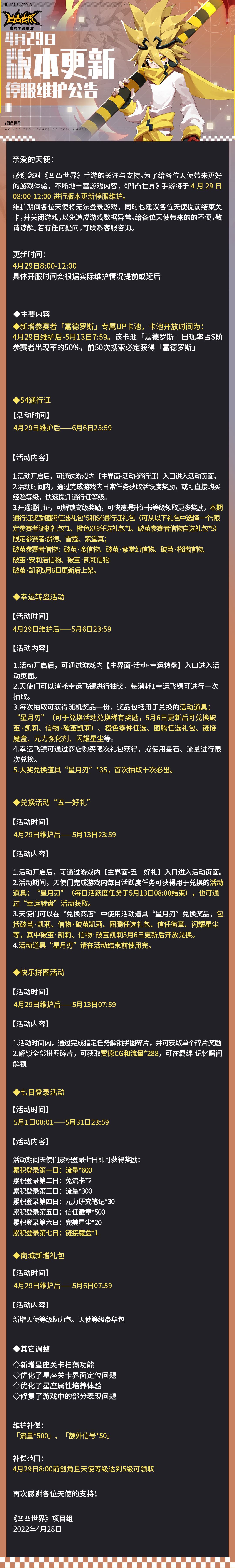 感谢您对《凹凸世界》手游的关注与支持。为了给各位天使带来更好的游戏体验,不断地丰富游戏内容,《凹凸世界》手游将于4月29日08:00-12:00进行版本更新停服维护。