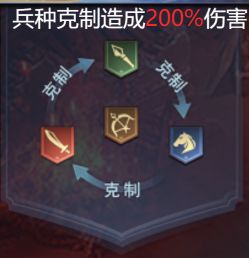 兵种克制会造成200%的伤害,因此,排兵布阵时要留意敌对的阵型,利用上克制的作用,更容易取胜。