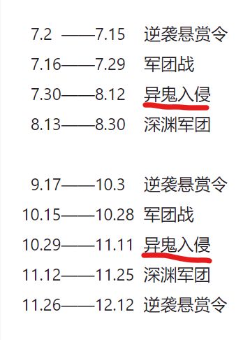 我们可以看到,之前的活动总是按照“逆袭悬赏令——军团战——异鬼入侵——深渊军团的顺序来,后来军团战出现的次数逐渐减少,逆袭悬赏令愈发受到青睐。之后过年期间加入的“生肖活动”和军团战差不太多,本质上仍属于打鬼,再后来的“天权演武”也是打鬼,不过是组合鬼,相当于大号的周末活动——鬼族入侵,不过可以用武器罢辽。就这样,一个完整打鬼宇宙构建完成了。