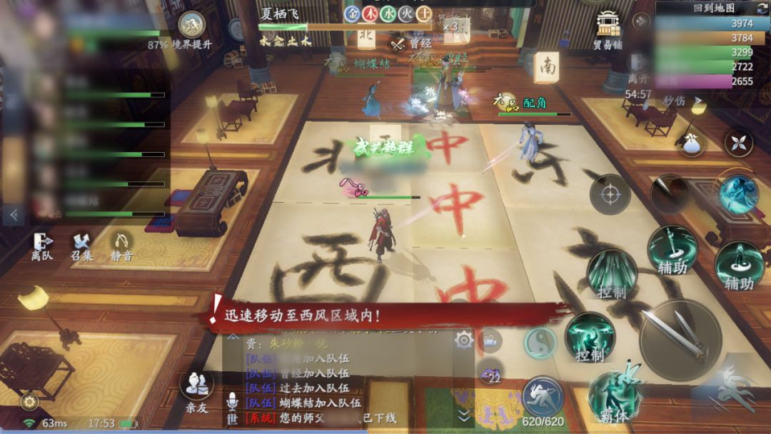 第二个技能【混一色】类似于老供奉的【嗜赌成性】,同样都是站位技能。不过不同的是,【混一色】技能所在的地图更小,地图总共划分为五块区域分别对应了东、南、西、北四风以及红中,如果跑错站位或者不在正确的区域内,将会受到大量伤害。我们需要提前看好头上的麻将牌,来决定自己的站位,如图所示,我头上的这张牌是西风,因此站在西的位置上是安全的,同理,如果头上是红中,就站在场上中间红中的区域即可。