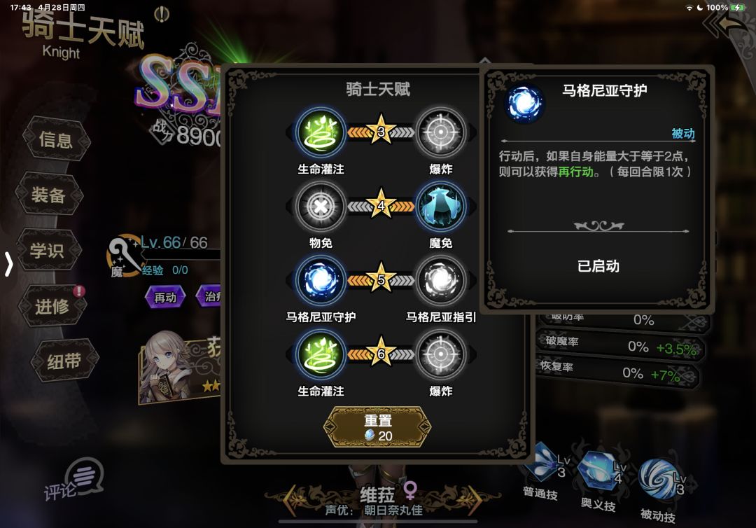 天赋上薇拉硬性要求5星天赋选择左边,可以保证部分回合后再动输出,提升效率。薇拉的奥义等级有条件的建议升至4级。