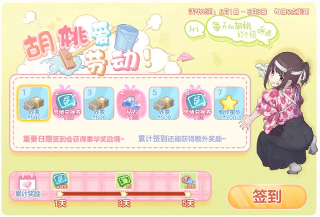 5月1日-5月8日期间,游戏内将开启专属签到活动,通过电视机进入对应活动界面即可参与。这个假期,胡桃劳动,你来领奖!每天来和胡桃打个招呼,就能领到当日好礼。钞票、钻石、思绪、福袋券...奖励可是很丰富的哦~