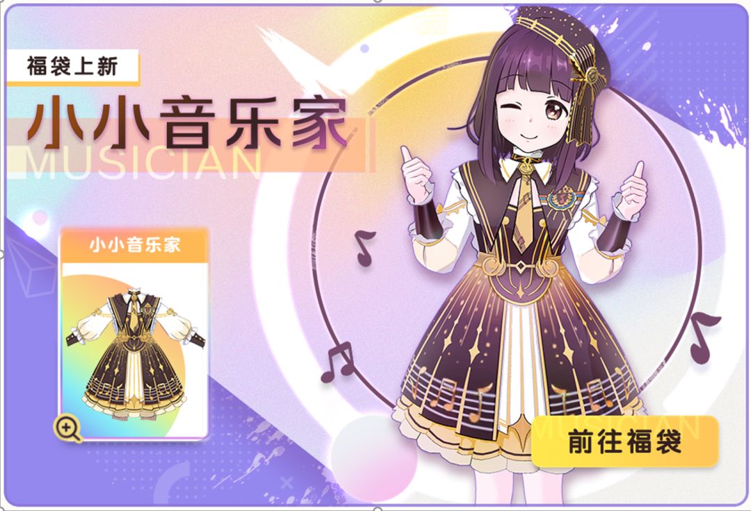 5月1日-5月4日,游戏内将开启新一期福袋,全新服装“小小音乐家”限时上架。胡桃的尤克里里现在已经可以弹得很熟练啦~谢谢你帮助胡桃向着音乐梦想努力!下个阶段,你希望胡桃挑战哪种乐器呢?嘻嘻,还是先换上新衣服来犒劳一下自己吧!