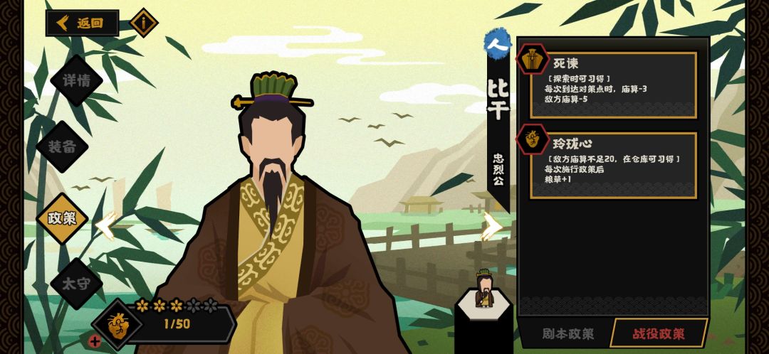 另外带廉颇减军心,墨子减少探索的不利影响。前期营地战选征兵减军心,军心满足条件后用间sl出齐姜的政策(9粮草),再减对面庙算,去仓库学比干的政策(9粮草)。有两个核心技能后营地商店所有低费用政策、投资政策买买买;投资类买齐,不探索也不缺粮了,然后营地商店buff类买完。