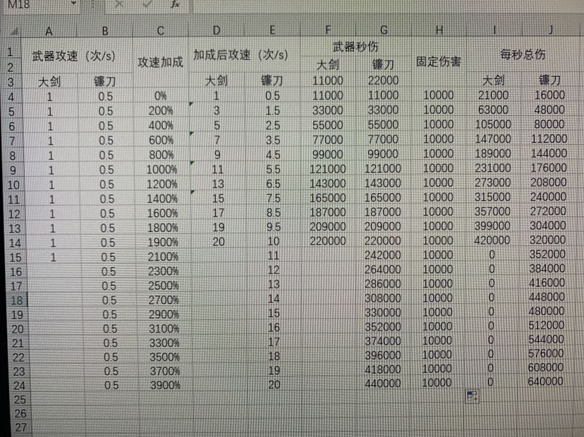 这张图可以看出,就单武器而言,镰刀刮10下就们造成大剑20下的伤害了,但还有除武器之外的额外伤害值,以1000武器举例,装备镰刀后总伤害值达到32000的时候,攻速加成为2700%时每秒造成的伤害是有提高的,并且武器伤害值占总伤害值的比例越高所需要的攻击速度提升就越少