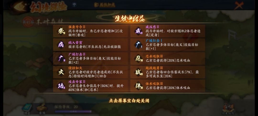 好在上有策划,下有对策,除了必选的广域12,威压2和病入膏肓几乎是必备的,刷脸克一手死长门影罗仙鸣死鼬(其实最难打的精英还是仙鸣,秒不掉就越打越肉),有侵掠如火之前建议无药可救,针对一些带自回的队伍。侵掠如火能刷就刷,后面用b班长克制武士道三船用。