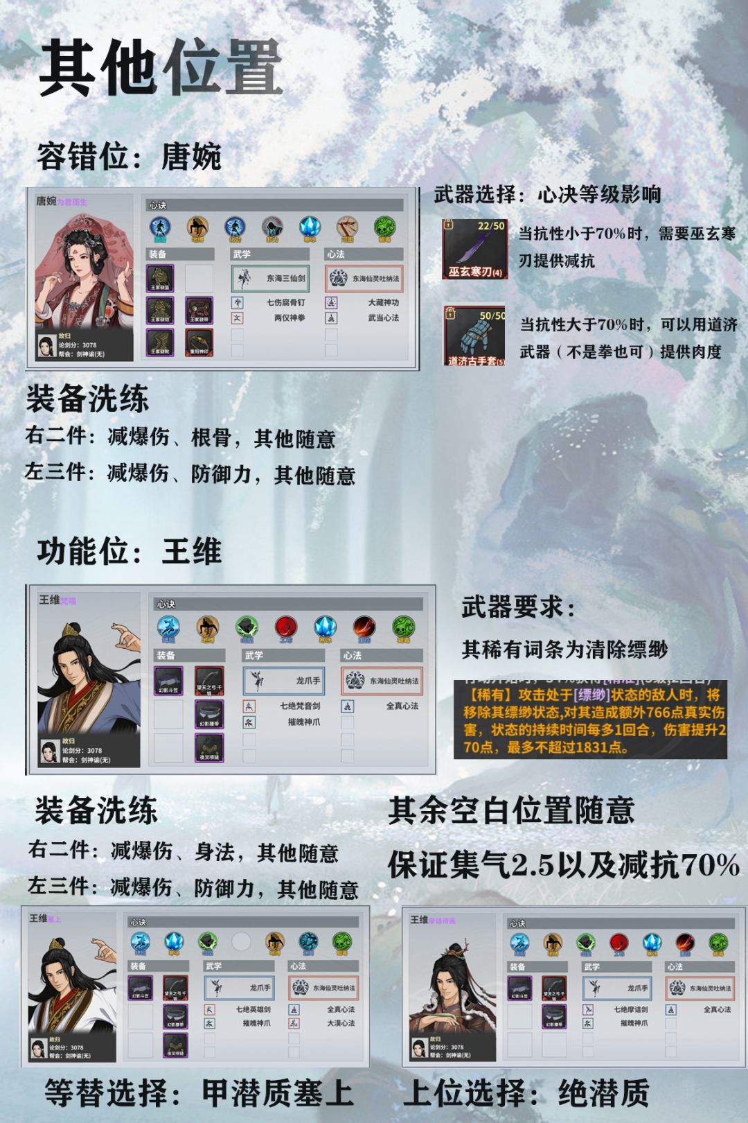 王维与糖丸都带地缚,能有效控制boss移动,从而做到控攻击距离的打法。这里需要注意,糖丸使用自带武学,其大招是根据身法差提供定身,这个技能在这里基本上是稳定定身,因此出现boss挣脱定身的时候,可以用这个技能补上。